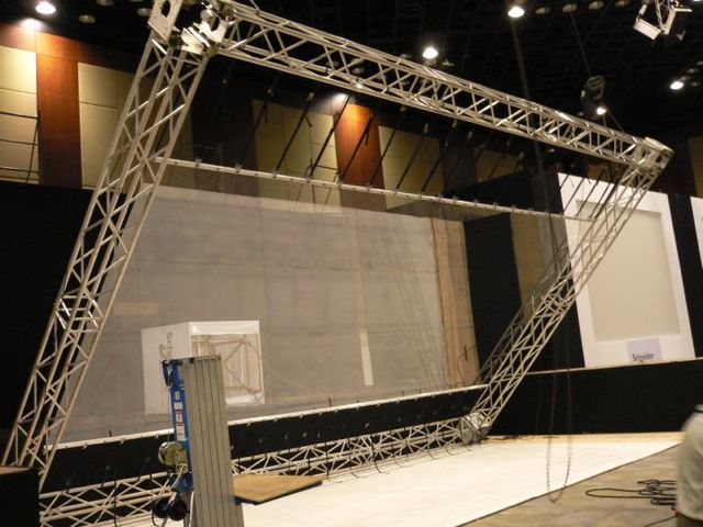 La mise en scène consiste essentiellement en une «boîte noire» construite en treillis d'aluminium, rideaux noirs, mise en scène, lumières et système audio.