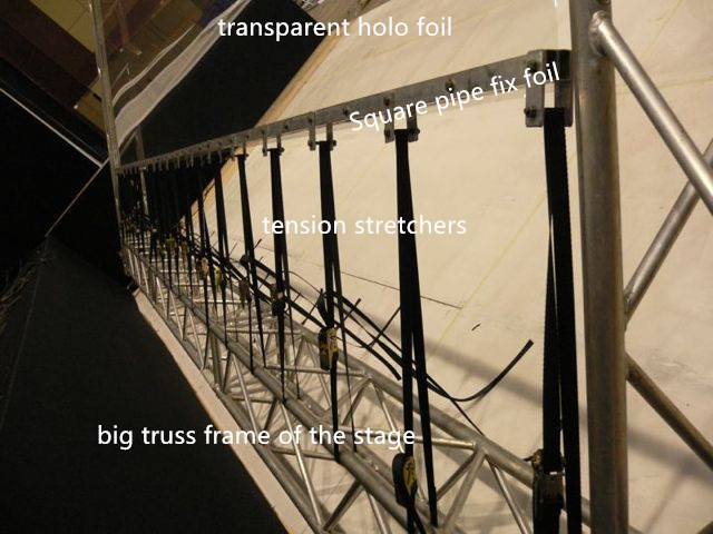 Ce que nous pouvons fournir est: la feuille transparente d'hologramme, le système de montage de tension et l'écran pour le système de réflexion.