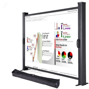Table Projection Screen menyediakan solusi sempurna untuk presentasi table-top di lingkungan bisnis dan pendidikan. Dengan desain casing yang inovatif, berat layar 40 "hanya 1,2 kg. Tidak diperlukan instalasi dan satu mekanisme penguncian tombol membuat layar sangat mudah dioperasikan. Mematikan kaki dasar akan membuka kunci layar dan setelah layar ditarik siap digunakan. Karena proyektor LED portabel dan ponsel dengan kemampuan proyeksi semakin populer, layar portabel meja menawarkan pengalaman menonton yang sangat baik untuk bisnis portabel. Desain layar desktop terbaru dengan desain mandiri alas kaki memungkinkan layar dihentikan pada posisi yang diinginkan.