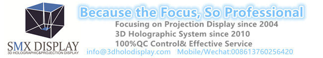 SMX DISPLAY هرگز از حرکت به جلو دست نمی کشد، به منظور عرضه خطوط محصول رقابتی برای مشتریان ما، در سال 2010، همراه با شرکای ما، ما یک کارخانه دیگر،که بر روی محصولات هولوگرافیک سه بعدی تمرکز دارد که شامل هولوکوب 180/270/360 درجه است، صفحه نمایش هولوگرافیک سه بعدی هرم؛ سیستم پروژکتور هولوگرافیک Pepper Ghost، پروژکتور هولوگرام سه بعدی، Holo Gauze، صفحه نمایش هولوگرافیک، فیلم های پروژکتور و محصولات پروژکتور هولوگرافیک مرتبط.