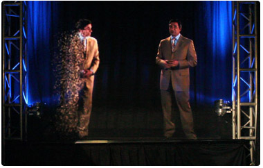 เราออกแบบสร้างและจัดการโครงการการติดตั้งโฮโลแกรม 3 มิติขนาดใหญ่ มันเป็นระบบเวทีโฮโลแกรมขนาดใหญ่ที่ช่วยให้สามารถแสดงภาพเหมือนจริงขนาดเท่าจริงได้ ใช้แนวคิดผีพริกไทย เราสามารถเพิ่มมิติใหม่ให้กับการเปิดตัวผลิตภัณฑ์ของคุณโดยเพิ่มการตั้งค่าโฮโลแกรม 3 มิติที่จะทำให้ผู้ชมของคุณประหลาดใจสามารถฉายภาพวิดีโอความละเอียดสูงระดับ 3 มิติได้ การฉายบนเวทีโฮโลแกรมของเราสามารถ 'ว้าว' และทำให้ผู้ชมของคุณหลงไหลอย่างที่ไม่เคยมีมาก่อน ไม่จำเป็นต้องใช้แว่นตาสามมิติเทคนิคการฉายภาพสามมิติที่เราใช้หมายความว่าโฮโลแกรมสามมิตินั้นดูเหมือนจะลอยอยู่บนเวทีด้วยความลึกที่น่าอัศจรรย์