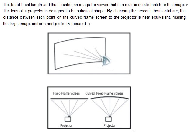 Màn hình khung cong cố định 3D rất lý tưởng cho các rạp chiếu phim hoặc ứng dụng mô phỏng. Sử dụng cấu trúc nhôm tiên tiến với mục tiêu tạo ra một hình ảnh phù hợp với đường cong tự nhiên của mắt người; màn hình này mang lại độ nét cao xem một cấp độ khác. Curved Screen là một giải pháp công nghệ màn hình độc quyền được thiết kế đặc biệt cho ứng dụng mô phỏng và đào tạo. Màn hình cong có thể có bán kính khác nhau, bề mặt hoàn thiện khác nhau.